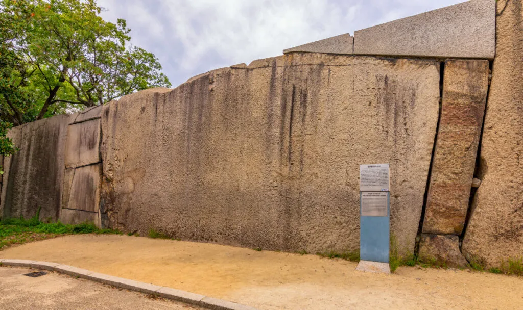 The walls of Osaka Castle, or the walls on which it stands, are built with massive granite blocks, some of which reach remarkable size and weight. A significant example is the Octopus Stone (Tako-ishi), located near the Sakura Gate, measuring approximately 5.5 meters (18 feet) by 11.7 meters (38 feet) and weighing over 130 tons (286,600 pounds).