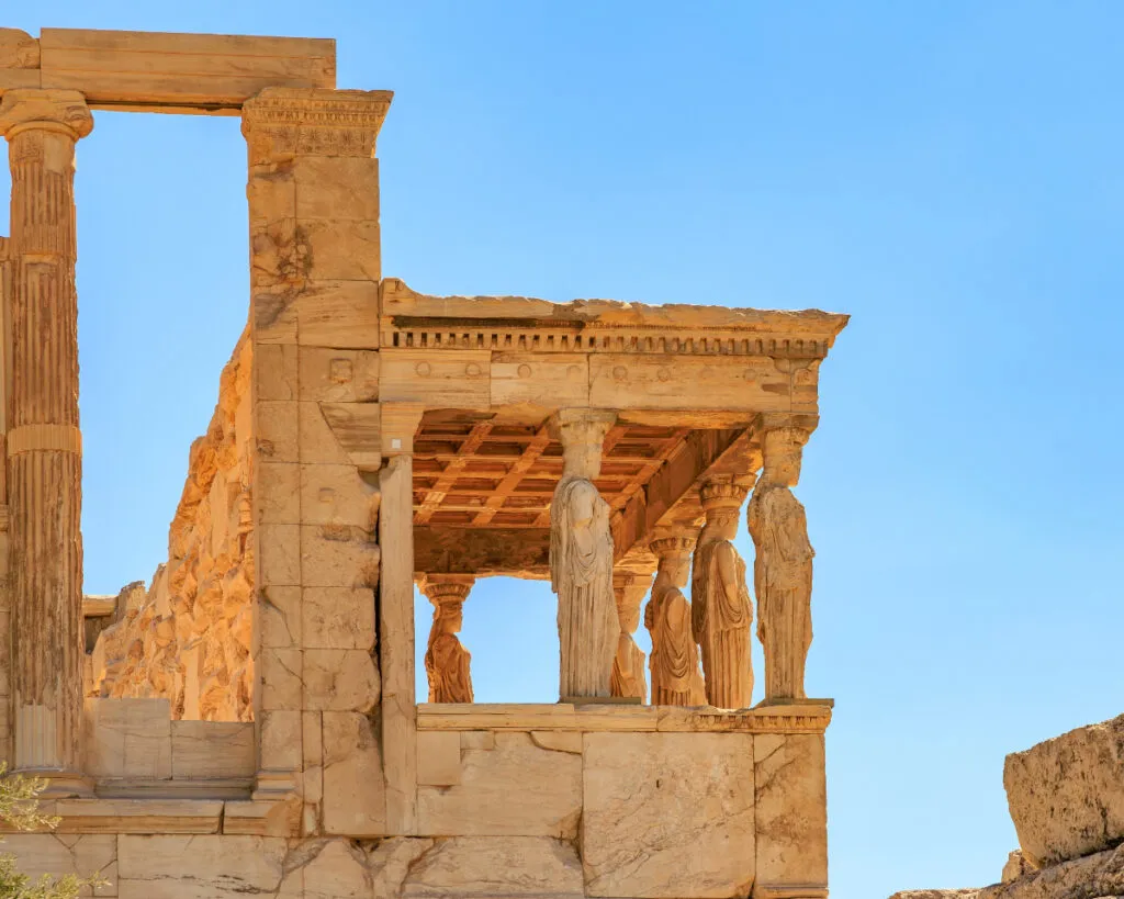 Il tempio è celebre soprattutto per la Loggia delle Cariatidi: sei figure femminili scolpite che reggono il tetto come colonne viventi. I loro capelli, scolpiti con grande attenzione e flusso verticale, rievocano una forma arcaica e potente della femminilità. Curiosamente, Schliemann ritrovò nelle profondità di Troia II (oltre 2000 anni prima) un vaso con capelli incisi che seguivano la stessa logica: dall’alto verso una coda centrale, come le Cariatidi.